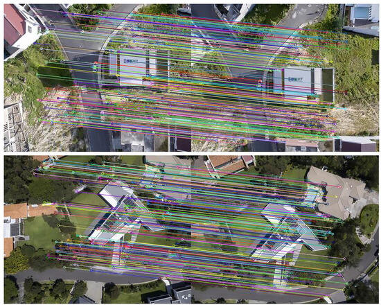 The algorithm was speeded up with a Graphic Processing Unit (GPU) to reduce the time cost. With the pairs of corresponded points obtained from the algorithm, a location observation method could be presented. In Figure 3, each pair of corresponded points is connected by a colored line. Additionally, during our hovering or small-area flight experiments, images were periodically compared with initial frames to avoid cumulative errors.