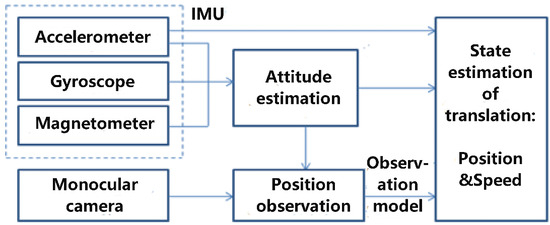 Previous research obtaining motion information with the assistance of a visual input has been carried out in several ways. Dual cameras could reconstruct the captured environment and obtain the location of the system using a stereo computer vision algorithm. These methods were mentioned in [9,10]. However, in a micro aerial vehicle system, the weight of onboard equipment is usually hoped to be as light as possible, with the consideration of payload and cruise duration of the vehicle. Therefore, monocular cameras and related algorithms have been researched and implemented in a wide range of applications.