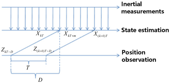 As shown in Figure 6, a new observation arrived at the time , which is actually measured at the time . The whole sequence of observations we have obtained during the time () does not change until a new observation arrives at the time . The optimal linear estimation of the state during the time () could be expressed as: