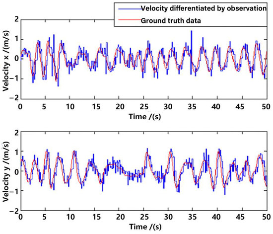 Position observation in the x-axis and y-axis from the visual method are shown in Figure 8, with a comparison to the ground truth position data. Evidently, there is a delay between the observation and the ground truth data, which is approximately 200 ms. Ignoring the delay, the error of the observation position is not very big, which proves the feasibility of the visual observation methods in Section 3. However, if one directly differentiates the observation position data for velocity, the error will be enlarged, which is shown in Figure 9. The velocity is a very important state for the control of the UAV [16,22]; that is why multi-sensor data fusion is essential in state estimation of the UAV.
