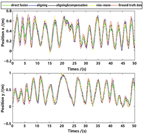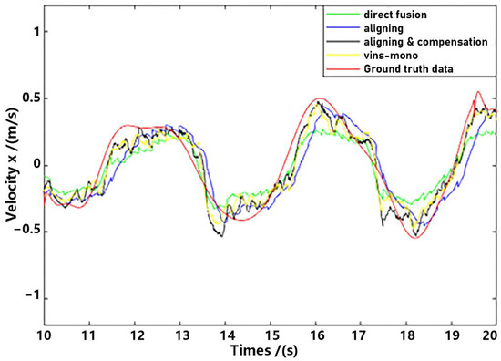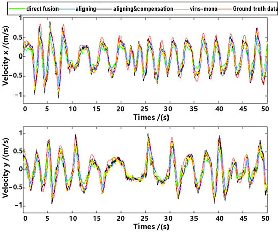 Observe that in the method proposed in this paper, data aligning and delay compensation were both executed, so the second method actually realizes part of the function of the proposed method. Performance on the whole for methods as well as the ground truth data were shown in Figure 11 and Figure 12, where “direct fusion”, “aligning”, “vins-mono” and “aligning & compensation” denote the first comparative method, the second comparative method, VINS-Mono method and our method, respectively. Figure 11 presents the position estimation results and the latter picture presents the velocity estimation results.