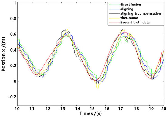 As shown in Figure 13 and Figure 14, there is a big error between the “direct fusion” estimation and the ground truth data, especially in the peaks and valleys. The reason for this phenomenon is that the observation data (position) and the input data (inertial measurements) are not aligned, and their effects on the estimation near the extreme value could be sign opposite, so the estimation could not reach to the true extreme value. There is an obvious delay between the “aligning” estimation and the ground truth data, which is expected because no delay compensation step was executed. The results of the “aligning and compensation” estimation, compared to the former two methods, have good performance both in accuracy and delay compensation.