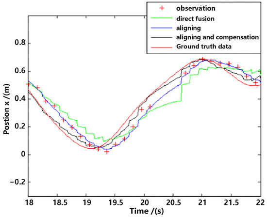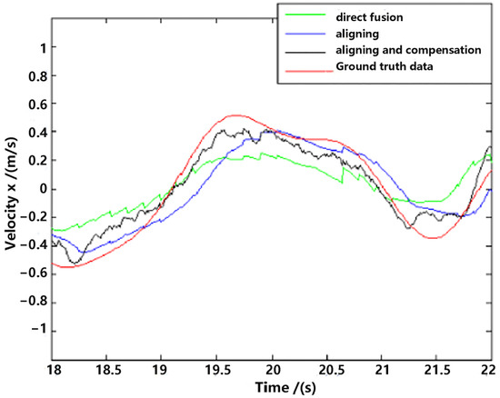 Table 1 shows the good performance of the proposed method (estimation with data aligning and delay compensation) in both position estimation and velocity estimation. The main disadvantage of the raw observation data is that there is a big error in velocity, as mentioned and shown in Figure 9. The “Aligning” estimation method outperformed the “direct fusion” estimation method, and the performance of the proposed “aligning and compensation” method improved observably compared to these two methods.