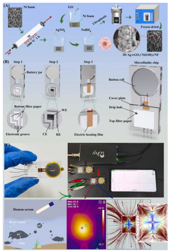 - Ma, S.; Zhao, W.; Zhang, Q.; Zhang, K.; Liang, C.; Wang, D.; Liu, X.; Zhan, X. A portable microfluidic electrochemical sensing platform for rapid detection of hazardous metal Pb2+ based on thermocapillary convection using 3D Ag-rGO-f-Ni(OH)2/NF as a signal amplifying element. J. Hazard. Mater. 2023, 448, 130923. [Google Scholar] [CrossRef]