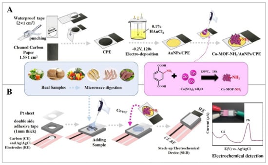 - Pang, Y.-H.; Yang, Q.-Y.; Jiang, R.; Wang, Y.-Y.; Shen, X.F. A stack-up electrochemical device based on metal-organic framework modified carbon paper for ultra-trace lead and cadmium ions detection. Food Chem. 2023, 398, 133822. [Google Scholar] [CrossRef]