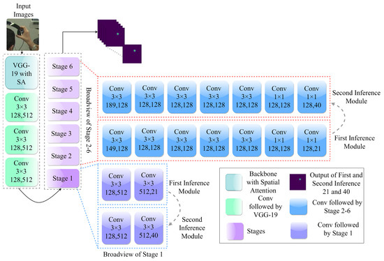 In the initial module, the VGG-19 architecture was used up to Conv as the fundamental feature extraction network followed by three convolutional layers that facilitated the generation of the initial heatmap. The VGG-19 architecture was enhanced by incorporating an SA module, generating 128 feature maps. The produced feature maps undergo information processing through a module that consists of six stages. These stages involve a series of continuous convolution layers with a specific kernel size , each incorporating a heatmap label as a supervisory mechanism. The generation of these labels was achieved by applying a Gaussian function to the corresponding ground truth, which is shown below.