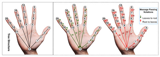 This research work adopted a tree-structured graphical model. One significant advantage of this model is the ability to accurately derive the marginal probability outlined in the earlier equation using belief propagation. Figure 4 illustrates the hand model arranged in a tree-like structure. Precise marginals can be determined by transmitting messages from the bottom-most nodes to the topmost node, and then back down to the lowest nodes. Numerical values are presented next to each arrow in Figure 4 with the schedule of message updates denoted by the number 3. In total, 40 message transmissions are adequate for obtaining accurate marginals.