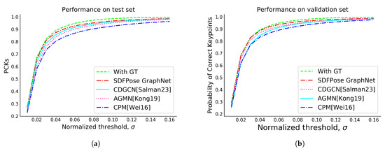 PCK evaluation for performance comparison: proposed model against existing models [12,16,33]. (a) Test; (b) Validation.