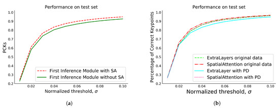 Table 6 and Table 7 show the numerical results of each module with preprocessed data. The quantitative results show that our proposed model performs better than the existing methods presented in [16,33] with processed and unprocessed data, even though we noticed that the median filter applied on the dataset causes an information loss. Figure 8b illustrates the PCK with original and preprocessed data in the test dataset.
