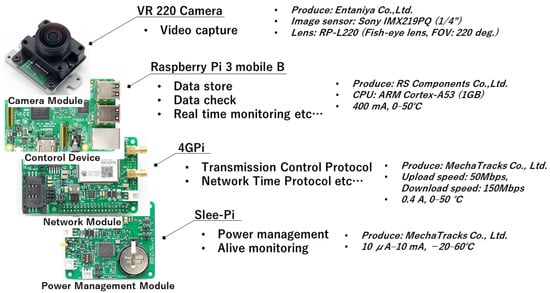 Figure 2 shows a diagram of the components of the APC hardware, and Table 1 shows the specifications of each part. A single-board computer (Raspberry Pi 3 model B) was used as the system board that controlled the video capture, encoding, Transmission Control Protocol (TCP) communication via a network module (4GPi), time management and power supply management via a power supply unit (sleePi). A dedicated camera module for Raspberry Pi (VR220) was used as the camera tool, and this was mounted with a fish-eye lens (RP-L220) for equidistant shooting that can capture a field of view of up to a maximum of 220°. Because sudden rain was also anticipated at the actual shooting site, this equipment was protected with a custom-made waterproof case. Although it is desirable to measure the tilt and level azimuth of the APC continuously and accurately, for example, by using a tilt sensor or geomagnetic sensor, in this study these were simply adjusted by using an electronic compass and water level. In this research, the output pixel size of the video was set to 960 pixels in both width and height to save on the capacity of measured data.