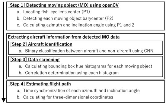 Figure 3 shows a flowchart of the analysis algorithm for flight path inference in this study. Methods that employ YOLO [13] for this kind of moving object (MO) identification have become mainstream in recent years, and our system can potentially also be migrated to this method in the future. As shown in Figure 3, a conventional method based on MO detection and a convolutional neural network (CNN) [14] was used to perform post facto analysis of the video captured at each site. First, MO detection of barycenter pixels of all MOs captured in the video at each site was performed using openCV [15], and the values of the azimuth angle and angle of elevation of the MO at each time were calculated from the coordinates and center of the fish-eye lens (Step 1). Although the sky occupies most of the image when the sky is filmed using a fish-eye lens, the ground is also captured around the edges of the lens because the field of view is wide. Because of this, the MOs from MO detection are not limited to flying objects such as aircraft, birds and insects. MOs are also detected on the ground, such as people, cars and trees, and these constitute noise that obscures the information about the aircraft. To extract aircraft information from the data, aircraft identification is performed by CNN (Step 2), and processing combines this with data screening based on this identification result (Step 3). In Step 4, the extracted continuous values of the angle of each aircraft at each site are time synchronized, and the coordinates are calculated by the method of forward intersection from surveying [16] based on this angle information and the coordinates of each measurement site. The details of the processing method in each step are described below.