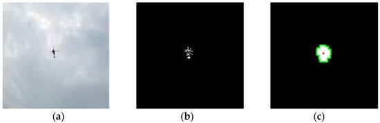 Example frames for calculations in motion detection analysis: (a) original video; (b) result of frame difference calculation, grayscale conversion and image binarization; (c) result of dilation, object contour detection and barycentric coordinate estimation.