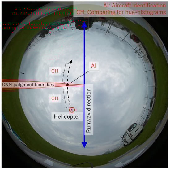 Figure 6 shows an image for the extraction of aircraft information from data calculated by the above MO detection. In cases such as urban areas and green areas where the video captured by the APC can easily capture MO other than aircraft, the amount of MO information analyzed in Step 1 increases greatly. When mechanical processing is performed on this kind of MO data, the processing time also increases proportionally. In this study, the measurement target is aircraft flying at low altitude near airfields, and these aircraft regularly fly along a path in the runway direction (blue line in Figure 6). In this study, boundary lines (red lines in Figure 6) through which the aircraft always pass were set on the camera lens, and a CNN was used to perform binary classification limited to MOs that pass through this region. The classification of aircraft outside this range and other MOs is determined by calculating the correlations of the hue histograms for each MO at each moment.
