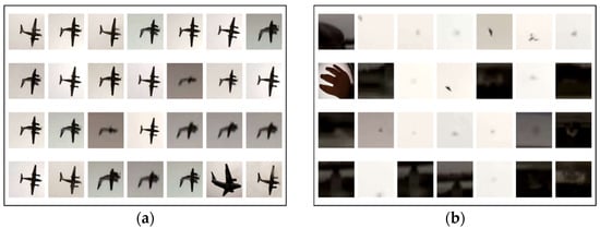 In the binary classification of aircraft and other MOs using a CNN, bounding box images of the MO detected at the same time as the MO detection calculation are used as training data. Figure 7 shows an example image of a training dataset. For the video for obtaining the training data, data captured in advance by the APC on a different day in the experiment were used in the case study described below. For classification annotations, all images are classified by visual determination as “aircraft” or “other” in the analyzed bounding box images. The aircraft set (left side in Figure 7) contains multiple aircraft types including jet planes, propeller planes and helicopters, and the non-aircraft set (right side in Figure 7) contains MOs such as people, birds, insects, trees and vehicles. In each category, 1000 images were used for training.