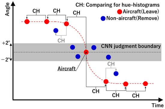 Figure 8 shows an image of the data screening based on judgment results from the CNN. First, a range of ±2° was set as the CNN judgment boundary, and binary classification by the CNN was performed on the bounding box images of MOs passing through this region. In this way, hue histograms were obtained for the bounding box images of MOs judged to be aircraft in the range of the boundaries, and the correlation coefficient was calculated between temporally adjacent MOs. If this correlation coefficient exceeds a threshold, the MO is judged to be an aircraft; otherwise, it is a non-aircraft. Then, screening is performed on only the aircraft information from among the MO information in the entire region by repeatedly performing this processing over time while updating the original histogram information. In this study, a correlation coefficient of ≥0.85 and a time interval of ≤2 s were set as the threshold for the correlation coefficient for judgment.