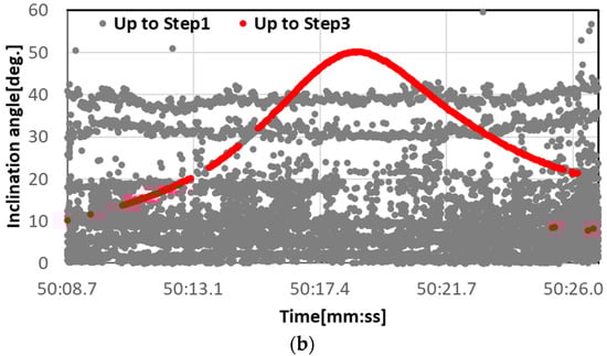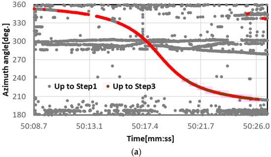 Example results of extracting aircraft information obtained from Steps 1 to 3. The vertical axis in (a) is the azimuth angle and that in (b) is the inclination angle. Both horizontal axes are time. The gray plots show the results up to Step 1, and the red plots show the results up to Step 3.
