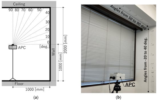 Figure 10 shows a schematic of the experiment and an actual photograph. The experiments were performed in the corner of a meeting room. The field of view of the fish-eye lens being used was 220°, and precise positions of 12 locations at intervals of 10° from −20° to +90° on the wall and ceiling were adjusted by laser rangefinder to cover half of that inclination angle range (110°). Note that in this investigation, the base of the fish-eye lens was assumed to be 0°. The APC was mounted on a tripod with a camera platform marked at 30° pitch, and 6 images were captured sequentially while rotating the camera orientation in 60° increments relative to the wall.