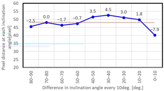 Figure 11 was obtained by taking the pixel coordinates of the center of the dome (90°) as the starting point and then lowering the starting point sequentially in 10° increments at the pixel distance between the coordinates at an angle 10° lower. The solid line shows the arithmetic mean over all trials when the angle of the APC to the wall was changed six times, the dotted line shows the arithmetic mean of the pixel distances obtained at all inclination angles, and the labels on each dot show the difference from the dotted line. Since the deviation depending on camera angle was less than one pixel, only the results for the arithmetic mean are shown. The arithmetic mean for all inclination angles was 48.07 pixels. Note that variation in value was large between different inclination angles, and particularly that from 10° to 0°. Furthermore, the arithmetic mean for the angles above 50° was relatively small, and the arithmetic mean for the lower angles excluding from 10° to 0° was relatively large. The fish-eye lens mounted on the equipment ideally offers equidistant shooting, but it actually had the distortion as shown in the results. We therefore adopted 4.807 pixel/degree as derived from the mean pixel distance of 48.07 pixels above as the pave, and also added the difference values at each inclination angle as determined from the experiments as correction terms for each calculated angle.
