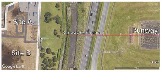 Figure 12 shows the measurement sites. This park is located about 150 m from the northern end of the runway, and aircraft pass overhead just before landing. The predicted flight paths of approaching aircraft were provisionally calculated based on the touchdown point and approach angle (assuming a gradient of 3°), and positions that give an inclination angle of 60° were adjusted with respect to the predicted flight paths. Figure 13 shows a sample frame of video captured during measurements. The weather on the measurement day had thin clouds that spread across the sky evenly without breaks, and the sun was also faintly visible. The flight paths were calculated by APC through the analysis method described above based on the video obtained through this measurement. The flight path obtained by the APC and the flight path obtained by ADS-B were converted into XYZ coordinates centered on the runway and cleaned up.