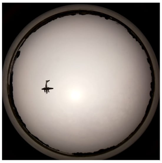 To investigate the performance of binary classification using this CNN, classification was performed on 3200 unknown measured images that were not contained in the training data (1600 in each category). Table 3 shows the confusion matrix of the results. The vertical direction shows the prediction results and the horizontal direction shows the classification results. The overall accuracy as shown at the bottom right was 86.7%. However, if we look at the aircraft column for the predicted label, this model had an accuracy of 99.9% for aircraft prediction, with almost no misidentifications. This high accuracy was obtained because the MO is clear when a low-altitude flying MO near a runway is captured by the APC, as shown in Figure 7. These conditions make it easy to distinguish aircraft MOs from non-aircraft MOs. The subsequent data screening was performed based on the judgment results from this model.