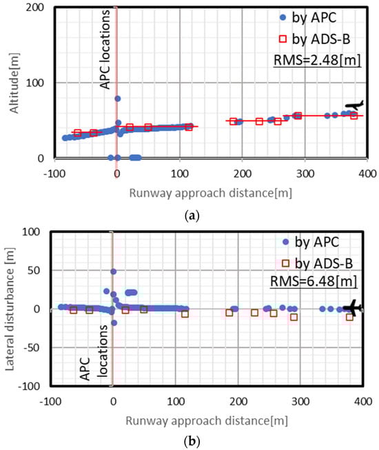 Figure 14 shows the flight paths obtained by both methods. In both graphs, the circles show the APC path and the squares show the ADS-B path, and the solid line on the left side shows the position where the APC was installed, and the landing direction of the aircraft is toward the left side of each panel. The root mean square errors between the close plots obtained by the two methods are indicated in each of the figures as RMSs.
