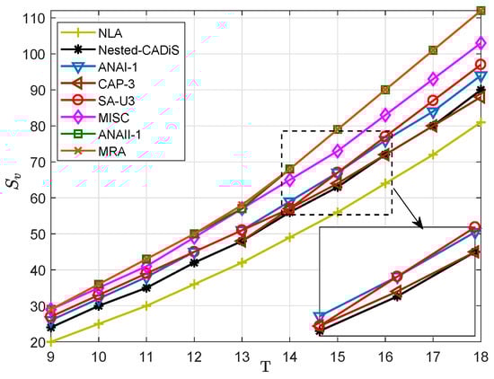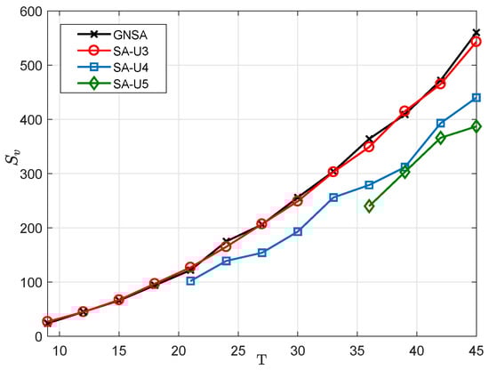 Then, we compare the SA-UQ with the GNSA. We vary T from 9 to 45 with three intervals. As for GNSA, we choose the MRA+MRA design model [], and the number of subarray sensors is , which can produce the biggest number of consecutive lags in the difference coarray. As for SA-UQ, we vary . As for SA-U4 and SA-U5, . When , if , ; if , ; and if , . When , if , . The results are shown in Figure 4. Here, we can find that SA-U3 can have the close to the GNSA. But, considering that the GNSA cannot be applied to any value of T, the 4C criterion is a more flexible design method. Moreover, comparing SA-UQ with different Q, we can obtain the lower with the increasing Q.