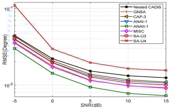 In this simulation, we compare the RMSE of SA-UQ with those of Nested CADiS, GNSA, CAP-3, ANAI-1, ANAII-1, and MISC. We set , , and vary SNR from −5 dB to 15 dB with 5 dB intervals. Assume that , where the signals are uniformly distributed from to . We conduct simulation times and the results are shown in Figure 6. With the increase in the SNR, the RMSEs decrease and decrease gradually more slowly. When considering the results of comparison of , we can find that the sparse array with bigger can have the lower RMSE using SS-MUSIC. Thus, ANAII-1 and MISC have the highest accuracy. SA-U3 has an RMSE close to that of ANA-1. SA-U4 and Nested CADiS have the lowest , so they have the biggest RMSEs.