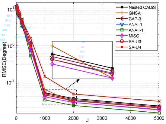 Based on Simulation 2, we set a fixed value for the SNR as 0dB, and vary J from . The results are presented in Figure 7. The simulation results show that as the number of snapshots increases, the RMSEs decrease. When , the RMSEs become flattened. Comparing the RMSEs of different sparse arrays, we can have the same conclusions as for Simulation 2.