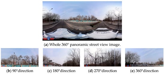 The reproduction of a 360° panoramic image results in a degree of spatial distortion, which causes a distorted panoramic street view image (Figure 1a); as there is the choice of every 90° angle of four directions of the frontal street view image data, the image data obtained are more closely related to the real situation of the street scene (such as Figure 1b–d). Since the purpose of this study is to detect and count the air conditioner external units hanging on the walls of buildings, it is sufficient to choose only two directions of 90° and 270°, i.e., the left and right directions of the road.
