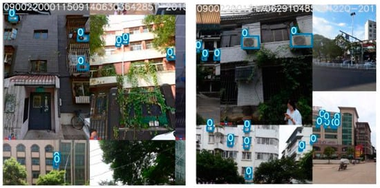 The SC4-YOLOv7 network model was used to detect the air conditioner external units on all the acquired street view image data of the main roads in Guilin, Guangxi Zhuang Autonomous Region, and the results achieved the expected goal: the air conditioner external units were accurately detected. Some of the results are shown in Figure 7.
