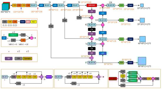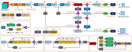 Therefore, this study utilizes YOLOv7 as its foundation, which is the most reliable iteration of the YOLO series to date. The ELAN network [35], an efficient aggregation network, is employed within the YOLOv7 architecture to optimize memory access costs and GPU computing efficiency. In order to prevent information over-inflation and loss during multi-layer propagation, the ELAN network facilitates interaction between layers, enabling deeper network depth and improved accuracy. The ELAN network structure controls connection paths of varying lengths to promote effective network learning and convergence. YOLOv7 incorporates module-level reparameterization techniques that break modules into several equivalent microstructures with consistent parameter transformations, which greatly enriches training resources and enhances model performance while maintaining prediction consistency with previous YOLO iterations. The YOLOv7 architecture retains the three-part structure of its predecessors—including the backbone, neck, and YOLOHead—and is illustrated in Figure 3.