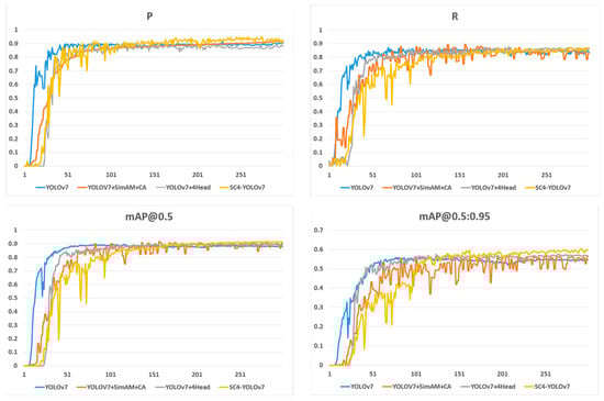 where, TP represents the actual positive samples that were detected as positive, FP represents the actual negative samples that were erroneously detected as positive, and FN represents the actual negative samples that were correctly detected as negative. In turn, P corresponds to the ratio of correctly predicted outcomes to all predicted positive cases, whereas R pertains to the ratio of correctly predicted outcomes to all positive cases. The area under the P-R curve represents the AP value, with the mAP value calculated as the average AP values across all categories. To evaluate the detection performance of the complete target detection network model, the mAP value is commonly employed. For mAP@0.5, IoU (Intersection over Union) is established at 0.5, with the AP of all images in every category calculated and averaged across all categories. Similarly, mAP@0.5:0.95 is representative of the average mAP across distinct IoU thresholds (ranging from 0.5 to 0.95 in increments of 0.05).
