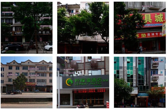 This study focuses on the urban area of Guilin City, located in the Guangxi Zhuang Autonomous Region of China, as the study area for extracting air conditioner external units from street view image data on buildings along the roads. Guilin City, a renowned tourist destination, is situated in a subtropical region and experiences recurring high-temperature heat waves annually, posing a substantial threat to both local population and international visitors. As one of the initial cities chosen for China’s Sustainable Development Demonstration, Guilin is in immediate need of conducting research on high-impact urban disaster response and sustainable development. The construction of target detection models heavily relies on rich and rigorous data sets [31]. The street view images predominantly cover the main roads in Guilin City, with fixed points established every 25 m in the continuous urban main road network data, resulting in a total of 61,929 distinct road network coordinate points. By utilizing the acquired coordinate point information, a bulk collection of 123,858 street view images from both sides of the road was achieved through the Baidu panorama service. Subsequently, redundant street view images displaying excessive similarity were manually eliminated, resulting in the selection of 5680 instances of air conditioner external units as the training data set. The data set is comprehensive in its coverage, containing individual examples of air conditioner external units in a variety of states, including those obscured by trees and windows, those with small targets at a distance, and those placed in an oblique direction. In order to control the comprehensiveness and balance of the sample data set, we also manually screened the samples so that the number of samples of air-conditioning outboard units in each different state could occupy a large proportion. The screened street view images are annotated using the graphical image annotation tool ‘labelImg’ (https://github.com/tzutalin/labelImg, accessed on 8 October 2023). This tool identifies and frames all the air conditioner external units in each image, generating an XML file that contains the target type and coordinate information. The annotated data are then split in an 8:1:1 ratio for algorithm training, testing, and validation, respectively.