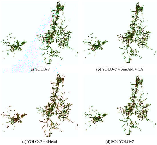 As can be clearly seen from the detection results point diagram, when the original YOLOv7 algorithm joins the small target detection layer, the network can pay more attention to the tiny target individuals and the checking of all rates by the algorithm increases significantly, so the image indicates a significantly greater number of orange and red dots. However, relatively, the algorithm accuracy will have a certain degree of reduction, that is, a large number of small target individuals that are not air conditioner external units will be used in air conditioner external unit detection. The YOLOv7 network with the attention mechanism can better focus on the required air conditioner external unit features from the complex background environment of the street view images, correctly detect and identify them, and improve the accuracy of the algorithm. The SC4-YOLOv7 algorithm in this study combines the above advantages and is generally optimal considering the accuracy of the detection under the condition of ensuring few or even no omissions.
