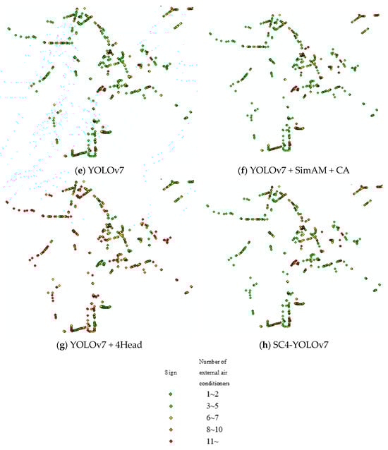 The new data combination is formed by counting the number of air conditioner external units detected in each street view image and combining the corresponding coordinate information. Using ArcGIS, an air conditioning statistical map is created based on geographical location and the number of detected frames, which corresponds to the number of detected air conditioner external units. In Guilin city, there are 61,929 coordinate points of road networks and 123,858 street view image data. The use of the YOLOv7 algorithm results in the detection of 13,806 street view image data, 11,752 coordinate points, and 87,176 air conditioner external units, while the YOLOv7 + SimAM + CA algorithm detects 13,873 street view image data, 11,805 coordinate points, and 99,234 air conditioner external units. Furthermore, using the YOLOv7 + 4Head algorithm, 13,959 street view images, 11,869 coordinate points, and 114,118 air conditioner external units are detected, while the SC4-YOLOv7 algorithm detects 13,933 street view images, 11,850 coordinate points, and 113,553 air conditioner external units. Notably, the SC4-YOLOv7 algorithm exhibits superior performance in detecting 113,553 air conditioner external units in 13,933 street view images with 11,850 coordinate points. Based on the detection statistics of each algorithm, a distribution map of air conditioners is generated, and part of the situation is shown in Figure 8.