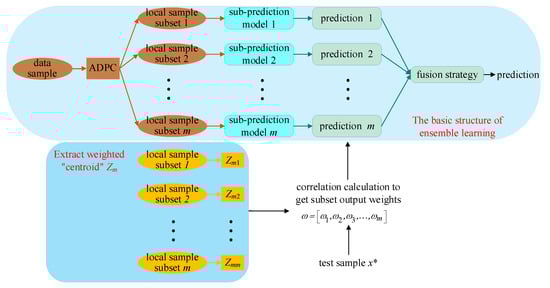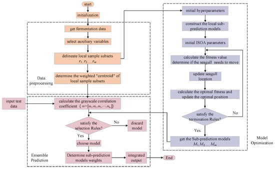 Considering the excellent characteristics of ensemble learning and the nonlinear, multivariate, and multi-stage features of the marine lysozyme fermentation process, this paper proposes a weighted ensemble learning soft sensor modeling method based on an improved seagull optimization algorithm and Gaussian process regression [18,19,20,21] (ISOA-GPR). The structure of ISOA-GPR weighted ensemble learning is shown in Figure 1. Firstly, an improved density peak clustering algorithm (ADPC) is used to partition subsets of local samples and generate ISOA-GPR sub-prediction models. Then, the improved grayscale correlation algorithm is used to extract the centroids of each local sample subset. The centroid is weighted by information entropy to generate a weighted “centroid” that more accurately represents the local sample subset features. Finally, a fusion strategy based on weighted improved grayscale correlation algorithm is proposed by selecting the sub-prediction models that highly correlated with the test samples. Applying the constructed soft sensor model to the problem of predicting bacterium concentration, substrate concentration, and relative enzyme activity in marine lysozyme fermentation, the simulation results show that compared with the single global soft sensor model based on ISOA-GPR, the prediction error and volatility of this model are smaller.