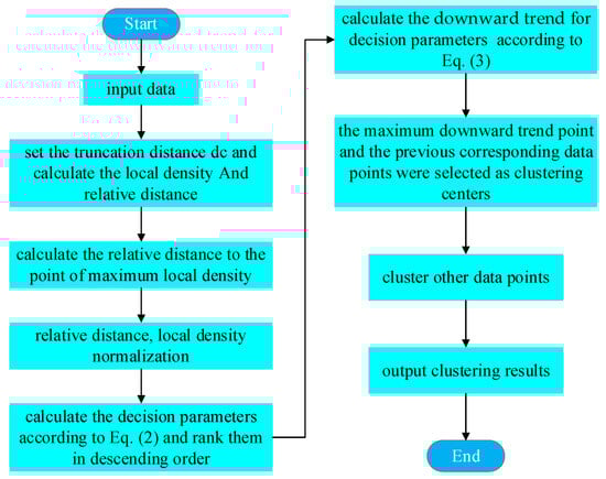 where represents the current value and represent the values at the preceding and subsequent places, respectively. According to the distribution of downward trend, select the data points with the highest downward trend and those before it as the clustering centers. The flowchart of the ADPC algorithm is shown in Figure 2.
