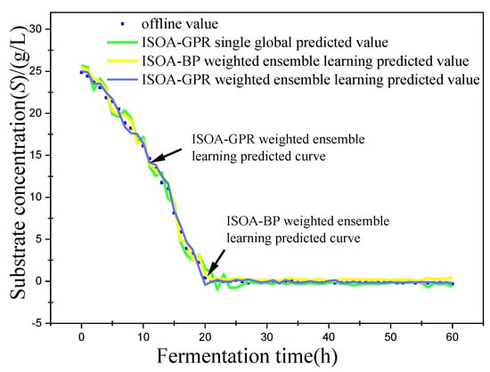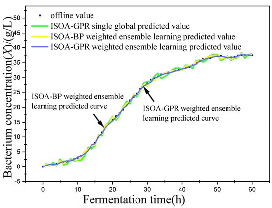 In this paper, bacterium concentration (X), substrate concentration (S), and relative enzyme activity (P) were taken as the most key biochemical parameters in marine lysozyme fermentation. An improved grayscale correlation algorithm was used to filter auxiliary variables and extract data from 15 fermentation batches. The first 12 batches, a total of 720 data points, were used as training samples and the last 3 batches, with a total of 180 data points, were used as test samples. These measurements’ values were used for training simulations based on a single global ISOA-GPR model, an ISOA-BP-weighted ensemble learning soft sensor model and an ISOA-GPR-weighted ensemble learning soft sensor model. The simulation results are depicted in Figure 6, Figure 7, Figure 8, Figure 9, Figure 10 and Figure 11. To show that the ISOA-GPR weighted ensemble learning soft sensor model performs better, root mean square and maximum absolute errors compare how well the three models can predict. The results are displayed in Table 1.