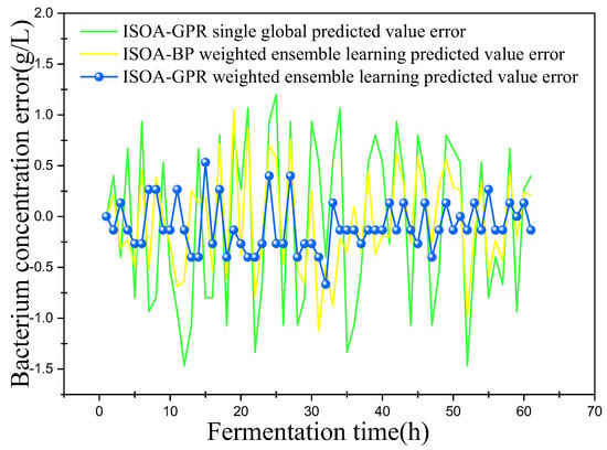 (1) It can be concluded from Figure 6 that all three models can predict the bacterium concentration well, and that the curve trend of the prediction model and the actual data are basically the same. It can be obtained in Figure 7 that, except for some individual data points (e.g., the 15th data point), the ISOA-GPR weighted ensemble learning model has the lowest prediction error and the ISOA-GPR single global model has the highest prediction error. Compared with the ISOA-GPR single global model and the ISOA-BP weighted ensemble learning model, the ISOA-GPR weighted ensemble learning model predicts a 68.6% and 48.2% lower root mean square error, respectively.