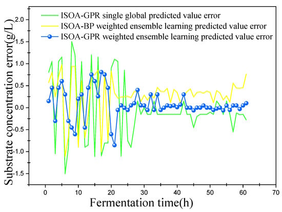 This paper established two sets of comparison experiments with ISOA-GPR single global, ISOA-GPR weighted ensemble learning and ISOA-GPR weighted ensemble learning; and ISOA-BP weighted ensemble learning. The predicted curves of key biochemical parameters (bacterium concentration, substrate concentration, and relative enzyme activity) for the marine lysozyme fermentation process were derived using each of the three models, as shown in Figure 6, Figure 8 and Figure 10. In order to clearly compare the prediction accuracy, the absolute error curves of the three key biochemical parameters predicted (bacterial concentration, substrate concentration, and relative enzyme activity) are shown in Figure 7, Figure 9 and Figure 11, respectively.