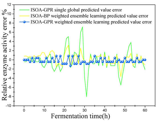 (3) When combined with Figure 10 and Figure 11, the ISOA-GPR single global model has the largest prediction error in the online prediction of relative enzyme activity and the error range could reach up to 8%. Compared with the ISOA-GPR single global model and the ISOA-BP weighted ensemble learning model, the ISOA-GPR weighted ensemble learning model predicts a 77.7% and 55.3% lower root mean square error, respectively.