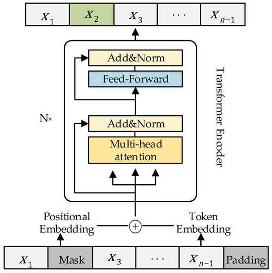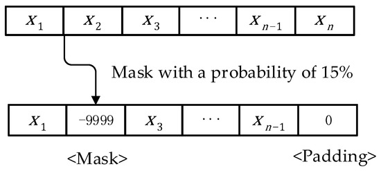 Using trajectory as a case in point, as depicted in Figure 1, where signifies the trajectory’s length. To find the quantity of masks in this paper, consult paper [26] and apply a 15% probability to mask the trajectory sequence. In contrast with other discrete sequences, the model is a continuously sequenced process, making it impossible to use a special symbol to represent the position of the mask. In this article, the mask point is set to −9999 for the task scenario in this paper, and to comply with the unified requirements for sequence length when calculating the BERT model, the position where padding must be 0 is specified. The BERT model is expected to be able to learn the meanings of mask and padding represented by −9999 and 0 respectively through training. The purpose of training is to learn how to estimate missing positions based on contextual information by processing the input trajectory with the mask and producing the corresponding mask position as the output.