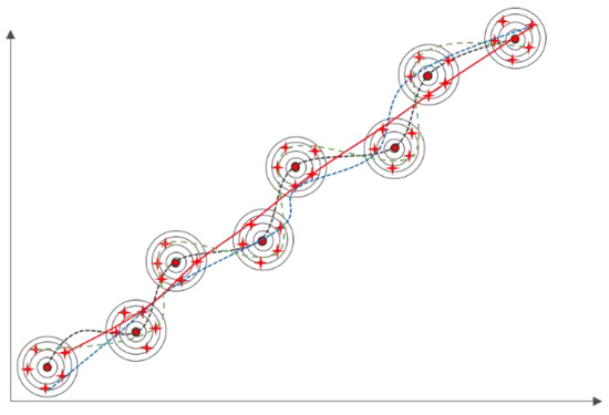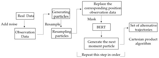In Algorithm B, the first and second particles are generated in the same method as in Algorithm A, but the third batch is generated in a different way, with the resulting particles constantly replacing the observed data. Therefore, when predicting the particles the next time, all the generated particles before the current time and the observed data after the current time are involved in the prediction. Figure 6 shows the process of constructing the set of alternative trajectories using the particle filter algorithm. After all the particles are obtained, the Cartesian product algorithm is used to cross-arrange and combine the particles to obtain the alternative trajectory set.