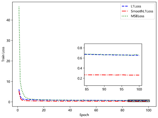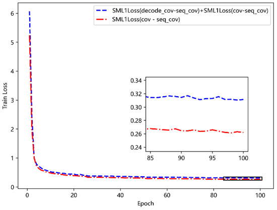 where is the true value, is the predicted value, when is less than 1, the square error is used, otherwise the linear error is used, which makes the SML1Loss can punish outliers (such as too large or too small outliers) less than the mean square error (MSE) and mean absolute error (MAE) loss function, so that the model is more robust. To avoid zero non-differentiable and gradient explosion, the training effects of the above three loss functions are compared in the subsequent chapters. The overall loss of the model is divided into three parts: covariance matrix (Loss1), decoder (Loss2), and MTM (Loss3), as shown in Equation (9).