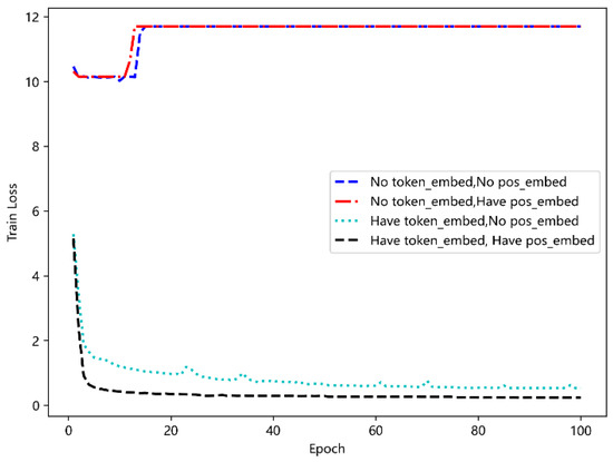 In order to verify the role of positional embedding and token embedding, the following comparative experiment is performed, as shown in Figure 10. It can be seen that the use of token embedding plays a great positive role in model training. For deep learning, a small dimension means insufficient description of the inherent laws of data, while dimension expansion after token embedding can better describe the characteristics of data [28]. In addition, there is time correlation between trajectory points, and the time characteristics cannot be well captured due to parallel calculation during model training. Therefore, by adding positional embedding, the model can learn the location information between data to improve the training performance of the model.