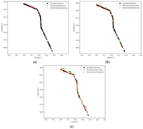 Verifying the model training effect: (a) Missing 20% of trajectory points; (b) Missing 40% of trajectory points; (c) Missing 80% of trajectory points.