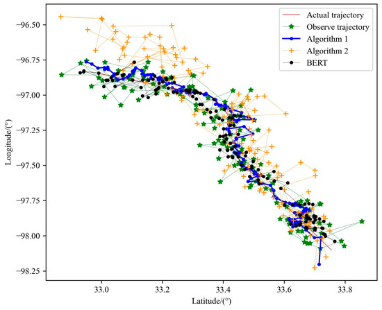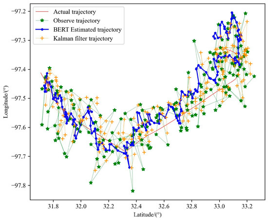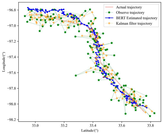 By comparing the experimental results shown in Figure 14, it can be seen that the optimized trajectory of the Kalman filter is more dependent on the observed data, that is, the optimization is carried out on the basis of the observed data, and is also affected by the equation of motion. The state equation is used to express the law of motion, which is equivalent to adding constraints to the motion and restricting the regional scope when locating the next point. Although this method can lead to more accurate positioning accuracy, there are still many errors when describing the motion state of the aircraft. The BERT trajectory pre-training model is obtained by training a large number of historical trajectories. Its internal parameters have been able to better express the trajectory motion law when dealing with noisy observation data, so the real trajectory can be smoothly and accurately optimized from the observation data, meaning the performance is more prominent, as shown in Table 5.