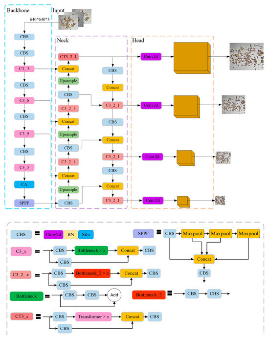22]. In addition, the transformer encoder is applied to the neck module to expand the receptive field of the network and make sure the network pays more attention to the effective feature information about the rice grain region. This makes the additional detection head more sensitive to small-sized objects. The remainder of this paper is structured as follows: