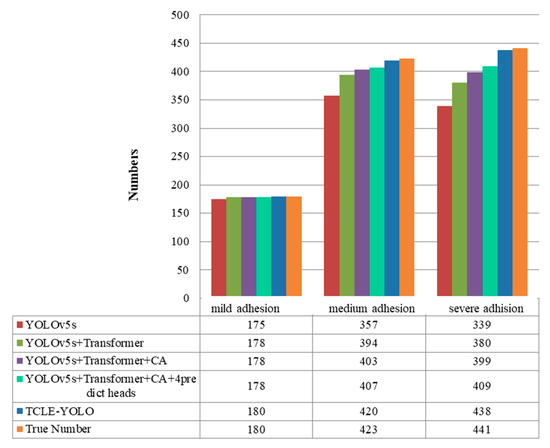 Figure 12, the YOLOv5s with different modules can detect almost all mildly adhesive grains, but the TCLE–YOLO model produced an outstanding counting result for severely adhesive rice grains. In summary, combining a transformer, a CA module, four prediction heads, and EIoU loss yielded the best performance. This indicates the power of combining the different modules mentioned above, as these can play a central role in guiding accurate thousand-grain weight measurements.