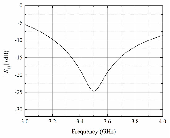 The simulated reflection coefficients are shown in Figure 3. It can be seen that the bandwidth of the printed dipole element ranges from 3.21 to 3.90 GHz. The relative bandwidth is calculated to be 19.7%. The reflection coefficient at 3.5 GHz center frequency is below −24.7 dB.